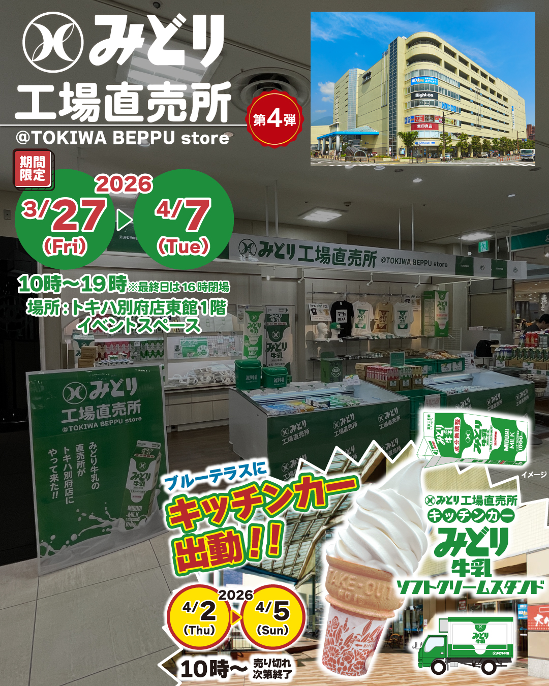 ※こちらの店舗では、九州乳業製品やグッズの販売のみで、ソフトクリームや揚げパンなどの店内調理品の販売はございませんが、2026年4月2日(木)~4月5日(日)に「トキハ別府店ブルーテラス」にみどり工場直売所のキッチンカーが出店いたします。
