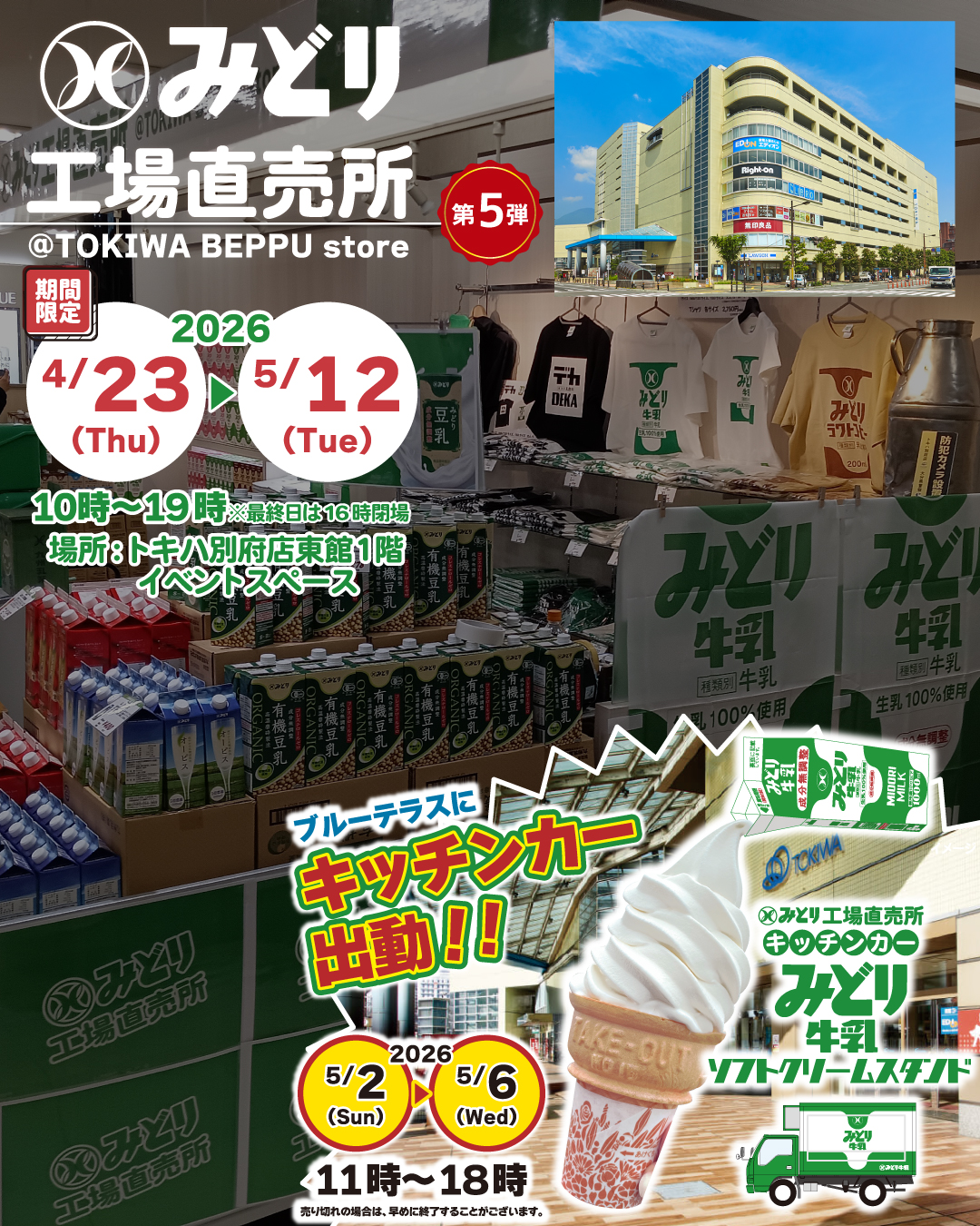 ※こちらの店舗では、九州乳業製品やグッズの販売のみで、ソフトクリームや揚げパンなどの店内調理品の販売はございませんが、2026年5月2日(土)~5月6日(水)に「トキハ別府店ブルーテラス」にみどり工場直売所のキッチンカーが出店いたします。