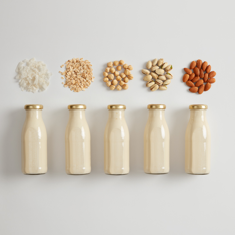 身近な植物性ミルクといえば、大豆を原料とする豆乳が代表的です。最近では、アーモンドミルクやオーツミルク・ライスミルク・ピー(エンドウマメ)ミルク・ココナッツミルク、またそれらをミックスしたものなど多種多様な製品が市場に出回っています。